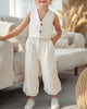 Beige striped trousers set is designed in elegant pastoral style, with sleeveless vest and wide-leg trousers. The striped pattern adds layering and the waist drawstring is adjustable, suitable for daily leisure or special occasions in spring and summer. Lightweight style and comfortable silhouette.