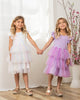 - Girls party dress features an elastic neckline that offers the flexibility of a square neckline and off-the-shoulder style. Cute and sweet ruffled puff sleeves, fashionable adjustable cross belt and A-line layered flared ruffled flowing hem highlight the girl's elegance. Smocked bodice and high-rise waist enhance the fit of the dress